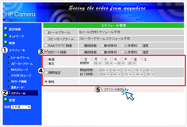 【スケジュール』内の【スケジュール】を選択し、【SDカード録画】にチェックを入れます。その後、下図の赤枠部分でスケジュールを設定してください。