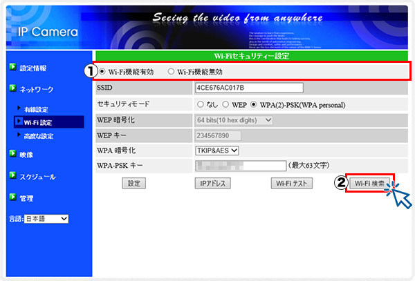 4.【Wi-Fi機能有効】にチェックを入れ、左下の【Wi-Fi検索】を左クリックします。