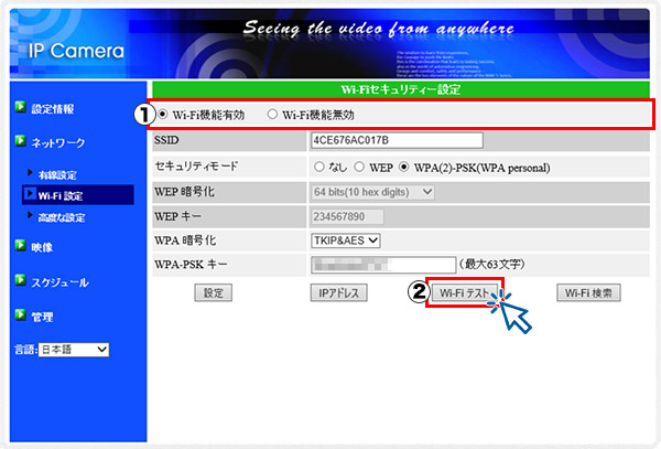 6.【WPA-PSKキー】にWi-Fi接続用のパスワードを入力し、【Wifiテスト】を実行します。