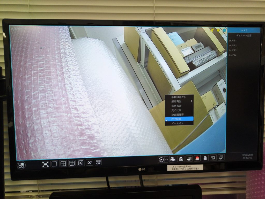 ①設定変更を行うカメラ単画面にて、マウスの右クリックを行い「PTZ制御」をクリックする。