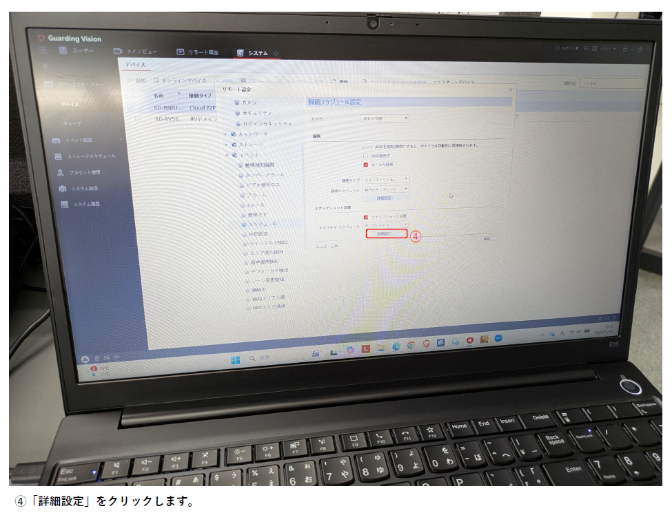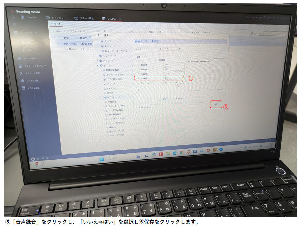 ホーム > GuardingVision / RD-RN8108シリーズ / カメラについて / ネットワークカメラの質問 PC版GuardingVisionから音声マイク付きカメラのマイクONとレコーダーの録音設定の方法について これでカメラのマイクがONになりました。次にレコーダーの録音の設定を行います。 カテゴリー:GuardingVisionRD-RN8108シリーズカメラについてネットワークカメラの質問 関連投稿 RD-RN8108シリーズ / RD-RV55シリーズ、RD-RV2704、RD-RV2804 GuardingVisionスマホアプリ 機器のシェア/共有方法 ネットワークカメラの質問 【RD-CIシリーズ】設定をリセットする方法はありますか? GuardingVision / RD-RN2504 / RD-RN2604 / RD-RN2804Sシリーズ / RD-RN50シリーズ / RD-RN8008シリーズ / RD-RN8108シリーズ / RD-RV30シリーズ / RD-RV35シリーズ / RD-RV55シリーズ、RD-RV2704、RD-RV2804 【QRコードでの遠隔接続の方法】/RD-RN,RVシリーズ/ カメラについて / ネットワークカメラの質問 【microSDカード・単独運用】RD-CIシリーズ・録画映像の再生手順について カメラについて カメラの仕様書・承認図・寸法図はありますか? RD-RN8108シリーズ 【遠隔監視(ローカル接続の場合) ※PCから確認する方法】RD-RN81シリーズ 前の投稿 【RD-RAシリーズ】レコーダーの録画が1~2日分しか保存されいない場合の対処法 次の投稿 GuardingVisionのアカウント登録について