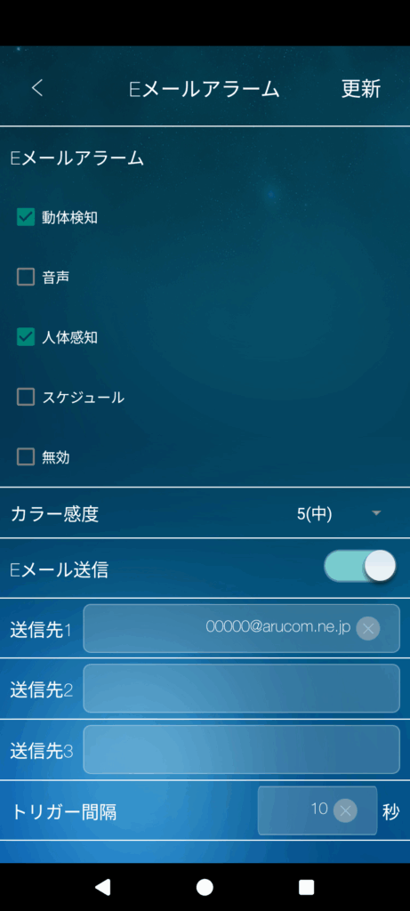 「Eメール送信」をオンにして「メールアドレス」を登録し、右上の更新ボタンを押すと