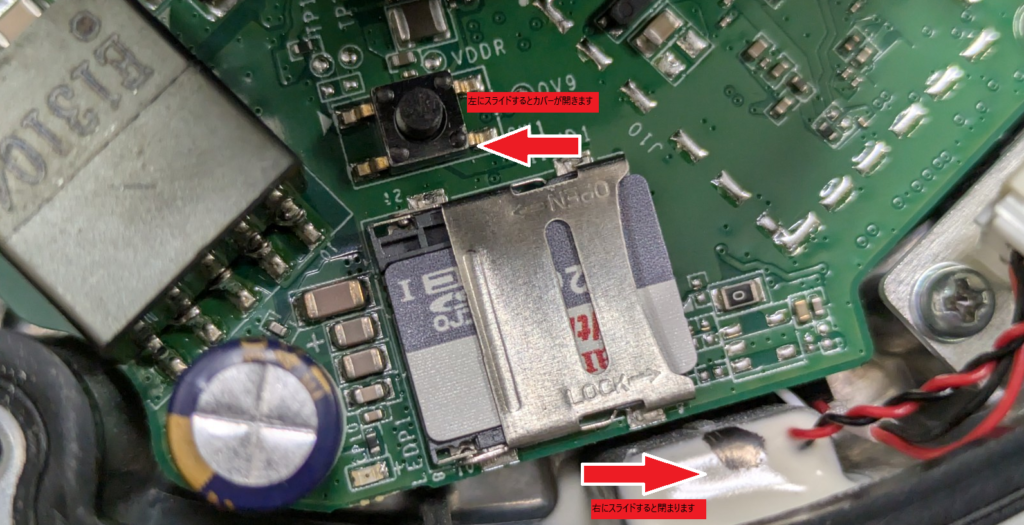 ③カバーを外すと基盤にmicroSDカードを挿入出来る箇所がありますのでカバーをOPENと書かれた方向にスライドさせると開きます。