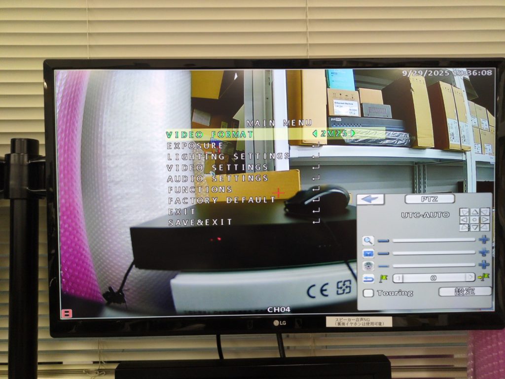 カメラメニュー表示が表示されますのでPTZコントローラーの下「▽」をクリックし「EXPOSURE」にカーソルを合わせて「・」をクリックする。「・」が決定ボタンになっております。