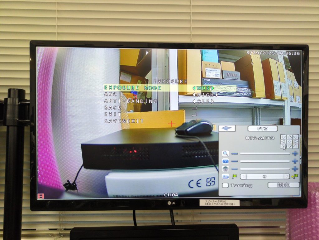 「EXPOSURE MODE」を選択し「WDR(ワイドダイナミックレンジ⇒屋外と屋内が同時に映る場面など)」または「HLC(高輝度補正)⇒夜間の車のライト、街灯など」または「BLC(逆光補正)⇒窓際、逆光の廊下など」に変更し、「SAVE&EXIT」で設定を保存してください。