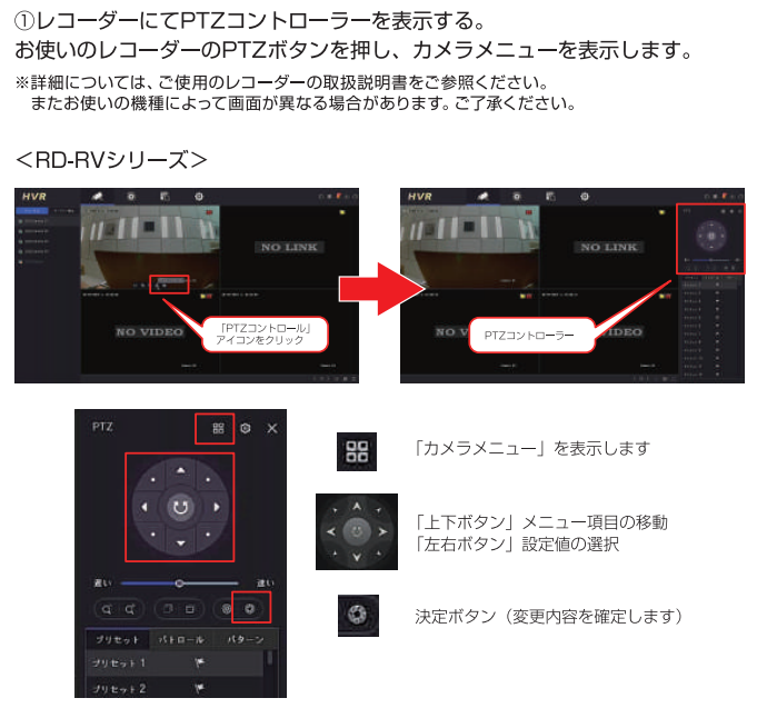 ホーム > RD-RA2104シリーズ / RD-RA2204シリーズ / RD-RA23シリーズ / RD-RA52xxシリーズ / レコーダーについて RD-RVシリーズでカメラ本体の設定メニューを表示する方法について カテゴリー:RD-RA2104シリーズRD-RA2204シリーズRD-RA23シリーズRD-RA52xxシリーズレコーダーについて 関連投稿 RD-RA2204シリーズ 【RD-RA52シリーズ】【RD-RA2204】CoC機能のやり方を教えてください。 RD-RA2204シリーズ 【RD-RA2204】手動で時刻を同期させる方法を教えてください。 RD-RA23シリーズ 【曜日や時間帯を指定して録画する(スケジュール録画)設定方法】/RD-RA2304シリーズ/ RD-RA2104シリーズ 【RD-RA2104】自動時刻同期設定の手順を教えてください。 RD-RA52xxシリーズ / レコーダーについて / 購入前の質問 【RD-RA5216】カメラ16台(16chモデル)の分割画面はどの様に表示されるの? レコーダーについて 映像を再生すると、右上に表示される日付・時間が画面から見切れます。変更方法はありますか? 前の投稿 RD-CV263SVWCの動きを検知して補助光ライトを自動点灯する設定方法について(SMART機能について) 次の投稿 RD-RAシリーズでカメラ本体の設定メニューを表示する方法について