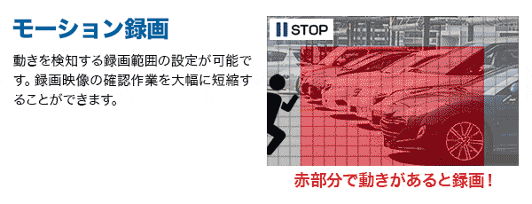 ホーム > レコーダーについて 動体検知(モーション録画)とはどういう機能ですか? カメラの撮影範囲に動きがあったときのみ録画を開始する機能です。 この機能を利用する事で、映像に動きの無い時間帯(無駄な録画時間帯)を省くことが出来ます。 カテゴリー:レコーダーについて 関連投稿 レコーダーについて ブラウザとは何ですか?アドレスバーはどこですか? RD-RA2104シリーズ / RD-RA2204シリーズ / RD-RA23シリーズ / RD-RA52xxシリーズ / レコーダーについて / 故障かなと思ったら / 購入後の質問 レコ-ダー本体から警報音が発生した場合の原因と対処法【RD-RAシリーズ】 RD-RA2204シリーズ / RD-RA23シリーズ / RD-RA52xxシリーズ / socatchシリーズ / レコーダーについて 【QRコードでの遠隔接続の方法】/RD-RAシリーズ/ レコーダーについて DDNSを登録する方法はありますか? RD-RN2504 / RD-RN2604 / RD-RN2804Sシリーズ / RD-RN50シリーズ / RD-RV35シリーズ / RD-RV55シリーズ、RD-RV2704、RD-RV2804 / レコーダーについて / 購入後の質問 メール発報設定について RD-RN8108シリーズ / レコーダーについて RD-RN8108Bでマウスカーソルが動かない場合の対処方法について 前の投稿 映像を再生すると、右上に表示される日付・時間が画面から見切れます。変更方法はありますか? 次の投稿 パスワードを変更したのですが、変更後のパスワードが分からなくなりました。初期化することはできますか?