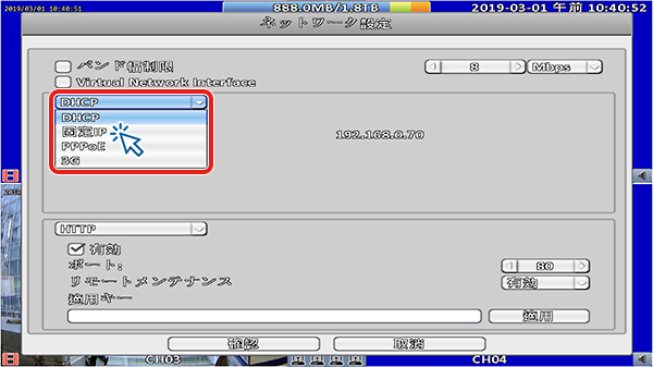 【DHCP】をクリックし、開かれたプルダウンメニューから【固定IP】を選択します。