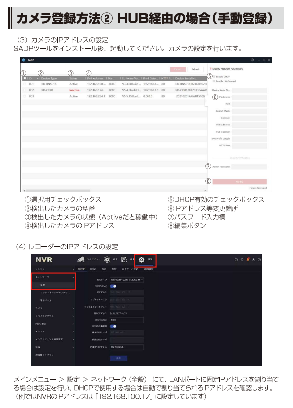ホーム > RD-RN2504 / RD-RN2604 / RD-RN2804Sシリーズ / RD-RN50シリーズ / RD-RN8008シリーズ / レコーダーについて RD-RNシリーズ ハブを経由したカメラの接続方法 SADPツールのダウンロードはこちら 詳細は取り扱い説明書.P25~27をご参照ください。 https://www.arucom.ne.jp/img/all_manual/date/rd-rn2684_ver1.2.pdf カテゴリー:RD-RN2504RD-RN2604RD-RN2804SシリーズRD-RN50シリーズRD-RN8008シリーズレコーダーについて 関連投稿 RD-RN50シリーズ 【RD-RN50シリーズ】PCにデータをダウンロードする方法を教えてください。 RD-RN2504 / RD-RN2604 / RD-RN2804Sシリーズ 【HDDのフォーマット】RD-RN2504/RN2604/RD-RN2804S RD-RN2504 【常時録画の設定方法】/RD-RN2504 RD-RN2604 RD-CI253/RD-RN2604の組み合わせでスマホアプリGuardingVision上から補助光オン/オフの設定方法 RD-RV30シリーズ / RD-RV35シリーズ / RD-RV55シリーズ、RD-RV2704、RD-RV2804 / レコーダーについて よくある質問集(RD-RVシリーズ) RD-RN2504 / RD-RN2604 / RD-RN2804Sシリーズ 【スケジュール録画(時間や曜日を指定して録画)】RD-RN2504,RD-RN2604,RD-RN2804S, 前の投稿 よくある質問集(RD-RVシリーズ) 次の投稿 よくある質問(同軸カメラ製品)