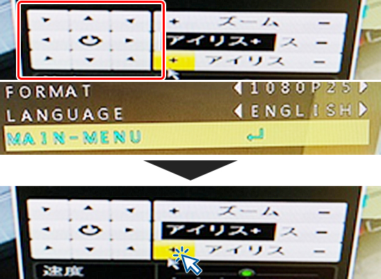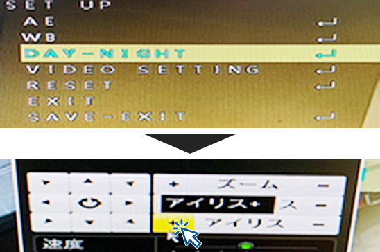 4.SET UPメニューが表示されたら上下左右キーで【DAY-NIGHT】へ移動し、アイリスの+をクリックします。