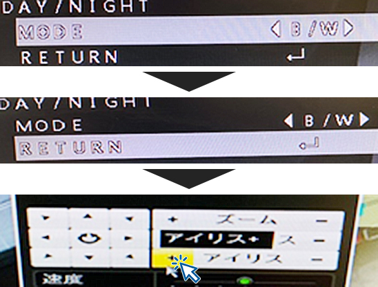 5.【MODE】の項目で左右キーを押して【B/W】を選択し、夜間モードに設定したら、【RETURN】へ移動してアイリスの+をクリックします。