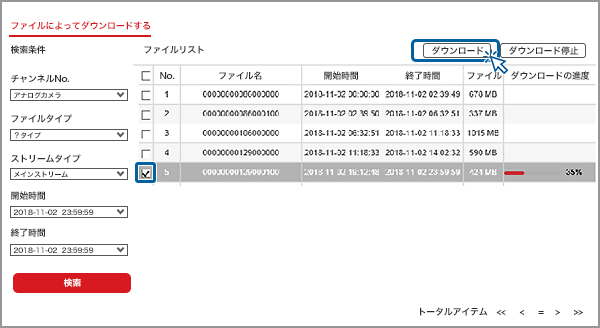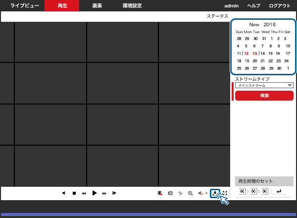 3.再生画面を開き、日時、時間を指定して【ダウンロード】アイコンをクリックします。