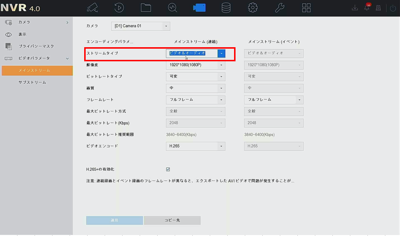 ①メインメニューよりカメラマーク>ビデオパラメータ>ストリームタイプにカーソルを合わせて【ビデオ&オーディオ】の項目を選びます。