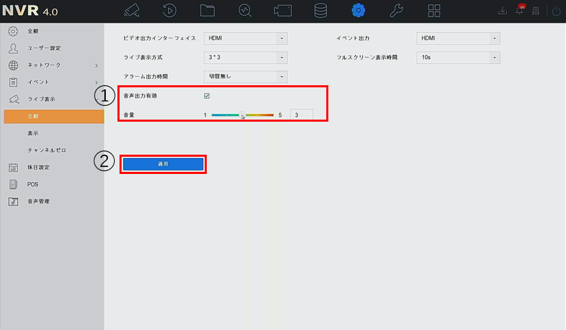 ③メインメニューより設定>ライブ表示>全般の順にクリックし、赤枠(1)で音声出力設定を有効にし、音量の設定を行う。設定後、赤枠(2)の適用をクリックします。