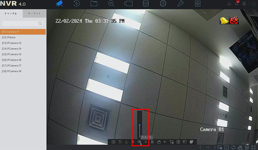 ④ライブ表示画面に戻り、カメラ映像下部分に表示される音量ボタンをクリックする事で音声が出力されます。音量の大きさも画面上で調整可能です。