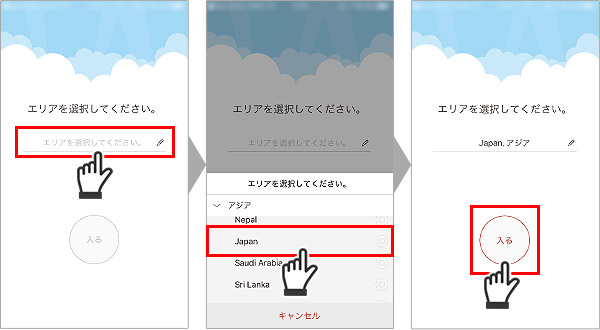 2.アプリを起動し、エリアの選択にて【アジア】→【Japan】を選択し、【入る】をタップします。
