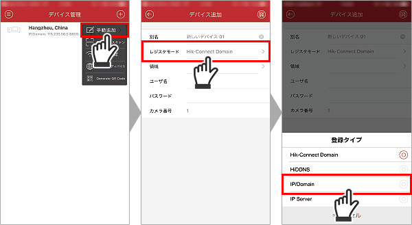4.表示されたメニューから【手動追加】をタップします。設定画面が表示されるので、【レジスタモード】を選択し、登録タイプを「IP/Domain」に変更します。