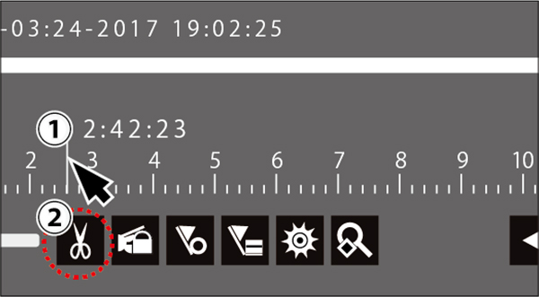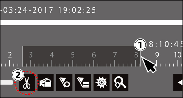 1.再生画面で、切り出したい映像の最初をクリックし、左下のはさみアイコンを選択します。