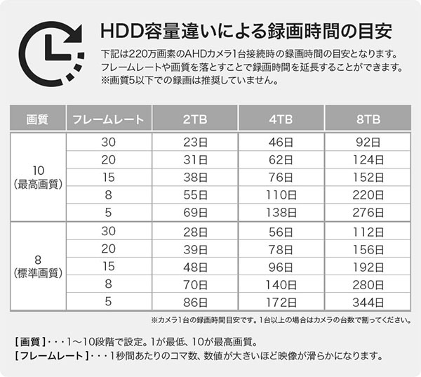 ホーム > レコーダーについて レコーダーはどのくらいの期間、録画データを保存できますか? 機種・HDD容量によって異なりますが、概ねHDD1TBで1週間前後となります。 ※解像度・画質・コマ数を変更することにより、録画時間をのばすことが可能です。 カテゴリー:レコーダーについて 関連投稿 RD-RA2104シリーズ / RD-RA2204シリーズ / RD-RA23シリーズ / RD-RA52xxシリーズ / レコーダーについて 【録音の設定】/RD-RAシリーズ/ レコーダーについて DDNSを登録する方法はありますか? RD-RN8108シリーズ / レコーダーについて PTZコントローラーの表示方法(RD-RN8108B/RD-RN8109B/RD-RN8116B/RD-RN8117B) RD-RN2504 / RD-RN2604 / RD-RN2804Sシリーズ / RD-RN50シリーズ / RD-RV35シリーズ / RD-RV55シリーズ、RD-RV2704、RD-RV2804 / レコーダーについて / 購入後の質問 メール発報設定について RD-RN8108シリーズ / レコーダーについて / レコーダーについて RD-RN8108B(NVR5.0)仮想ホスト(バーチャルホスト)機能の設定方法について RD-RN8108シリーズ / レコーダーについて / 購入後の質問 RD-RN8108B 動体検知録画の設定方法とその再生方法 前の投稿 パスワードを変更したのですが、変更後のパスワードが分からなくなりました。初期化することはできますか? 次の投稿 【RD-RA2004】画面がフリーズしてしまいました。