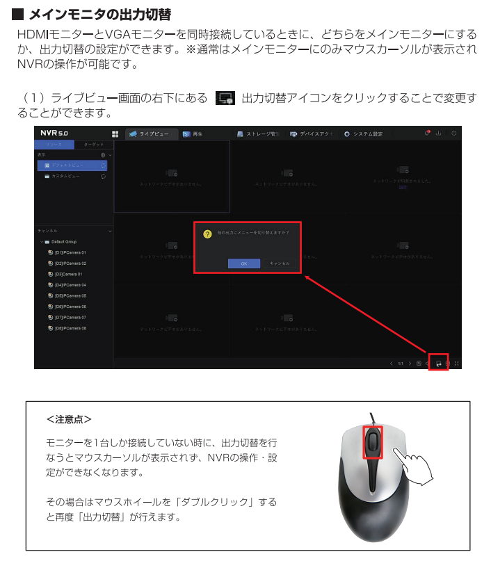 ③メインモニタ出力切替でマウスカーソルが表示されていない可能性があります。 (HDMIケーブルとVGAケーブルと両方で2台のモニターへ繋いでいる場合は、片方にマウスカーソルが表示されます。※同時に両方は操作出来ません。)