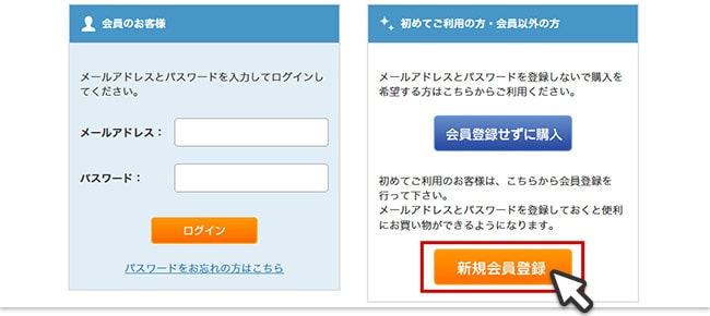 2.ログイン画面が表示されますので、初めてご利用する方で会員登録をご希望の方は、右側【新規会員登録】をクリックし、「会員登録フォームから登録する場合」と同様の手順で登録を行ってください。