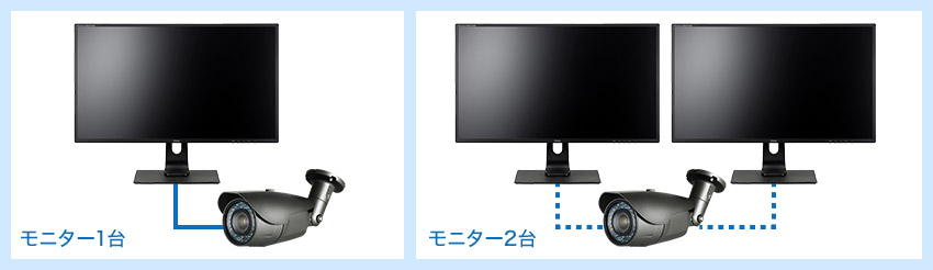 映像分配器という機器を使用する場合、1台のカメラを2台のモニターでご覧いただけます。