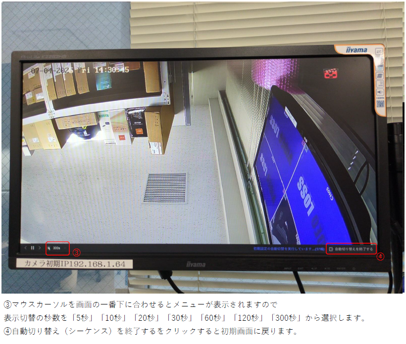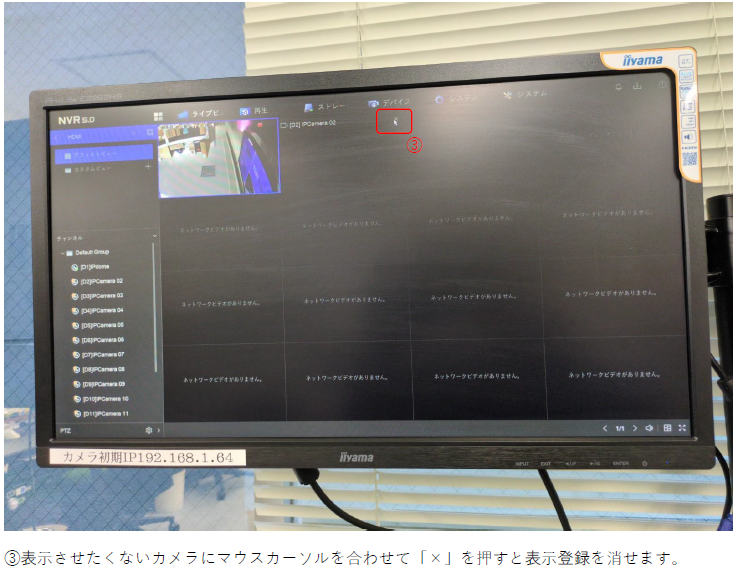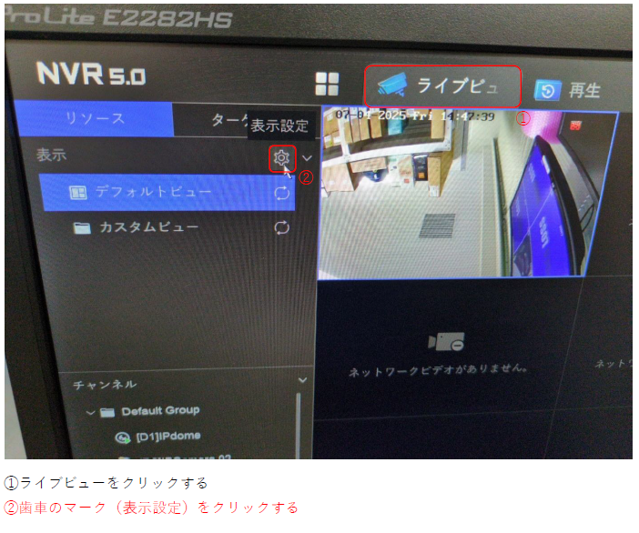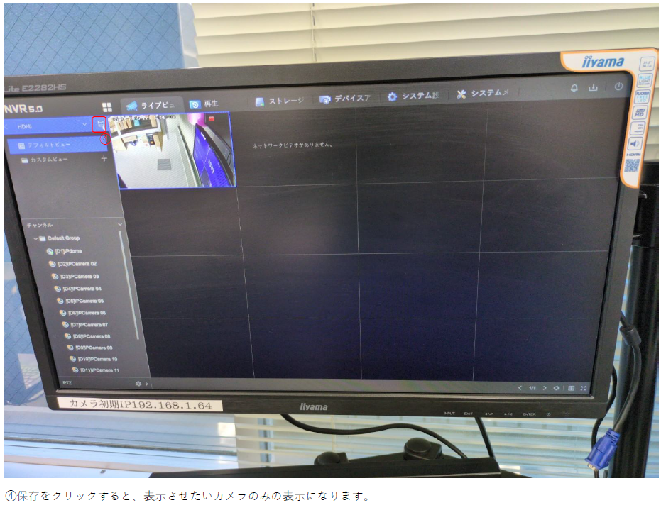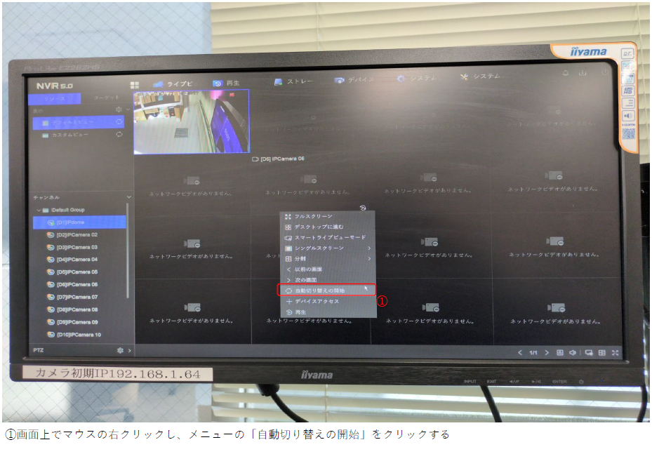 ホーム > RD-RN8108シリーズ / レコーダーについて RD-RN8108B(NVR5.0)の自動切り替え(シーケンス)の設定方法について 表示させたいカメラ画面を指定したい場合は下記の手順で可能です。 ※この設定はライブビューの表示のみ変更となりますので、録画の表示画面とは別になりますので 録画は通常通り保存されます。 カテゴリー:RD-RN8108シリーズレコーダーについて 関連投稿 RD-RN8008シリーズ / RD-RN8104 / RD-RN8108シリーズ 【出力解像度の変更方法】/RD-RN81シリーズ RD-RN8008シリーズ / RD-RN8108シリーズ 【全画面表示/分割表示】RD-RN8008/RN8108シリーズ RD-RN50シリーズ / レコーダーについて / レコーダーについて RD-RN5008仮想ホスト(バーチャルホスト)機能の設定方法について GuardingVision / RD-RN2504 / RD-RN2604 / RD-RN50シリーズ / RD-RN8008シリーズ / RD-RN8108シリーズ / RD-RV30シリーズ / RD-RV35シリーズ / RD-RV55シリーズ、RD-RV2704、RD-RV2804 【GuardingVisionの使い方】/RD-RVシリーズ,RNシリーズ/ レコーダーについて / レコーダーについて / 周辺機器について 【レコーダー】リモコンが欲しい・なくした・壊れた RD-RN8108シリーズ 【時間を指定して録画映像を再生】/RD-RN81シリーズ 前の投稿 RD-RN8108B(NVR5.0)のP2P接続方法について 次の投稿 RD-RN8116B(NVR5.0)のスケジュール再起動の設定方法について