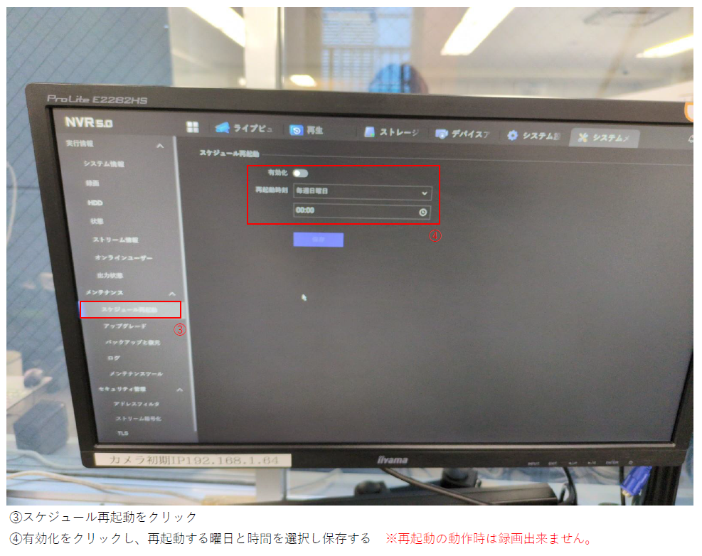 ホーム > RD-RN8108シリーズ / レコーダーについて RD-RN8116B(NVR5.0)のスケジュール再起動の設定方法について カテゴリー:RD-RN8108シリーズレコーダーについて 関連投稿 RD-RN8108シリーズ 【遠隔監視の設定方法(遠隔地の場合)】RD-RN81シリーズ RD-RN8108シリーズ / レコーダーについて RD-RN8108Bでマウスカーソルが動かない場合の対処方法について RD-RV35シリーズ / レコーダーについて 【前面・背面の各種端子について】/RD-RV35シリーズ/ レコーダーについて / レコーダーについて / 未分類 レコーダーのパスワードが分からなくなった場合のパスワード再登録方法について RD-RN8008シリーズ / RD-RN8104 / RD-RN8108シリーズ 【自動時刻同期設定の手順】/RD-RN81シリーズ RD-RN8008シリーズ / RD-RN8108シリーズ 【ライブ映像表示時の音声出力の設定手順】/RD-RN80シリーズ,RD-RN81シリーズ/ 前の投稿 RD-RN8108B(NVR5.0)の自動切り替え(シーケンス)の設定方法について 次の投稿 RD-RN8116B(NVR5.0)カメラ名称の変更方法